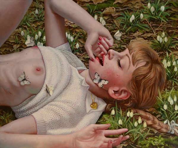 Curator: Erik Thor Sandberg's oil painting, entitled "Waning," immediately strikes me as a study in contrasts. The painting support itself is rather unique; its hexagonal form pushes against the realistic depictions, creating an almost surreal effect. Editor: Hexagonal, yes, like the facets of an insect's eye. That initial reaction, for me, is discomfort. There's something deeply unsettling about the figures, their scale, their expressions... Is that even an outdoor scene? The strange nest of critters above the doorway suggests an abandonment, a collapse. Curator: Precisely. Note the stark difference in textures—the smooth, almost porcelain skin of the figures versus the rough materiality implied in the ground and architectural element behind. And consider the use of color; the limited palette, focusing on earth tones and fleshy hues, enhances the sense of something decaying, hence the name I'd assume, waning. Editor: Symbolically, a woman is offering food to a large, infantile being. I’m tempted to ask, what appetites are being indulged here? And at what cost? The setting—the suggestion of classical architecture invaded by wildlife—presents a decay, perhaps even that of civilization succumbing to more primal urges. The bowl might symbolize indulgence, or maybe a vessel, from which the seated baby like form overindulges. Curator: The tension created between traditional genre-painting techniques, evident in the handling of light and shadow, with this contemporary, somewhat disturbing, subject matter is brilliant. Observe how Sandberg employs realism to depict the bizarre, achieving a visual paradox. This approach complicates any straightforward interpretation, requiring us to question the relationships, forms and structures presented within the piece. Editor: And even that strange spoon implies that the moment may occur over and over and over and over again... There’s a cyclical dimension to the image’s symbolism, a waning without end. In essence, is he pointing towards cultural decline— a regression to a more primitive, self-indulgent state? Curator: Yes, perhaps that circular reference of infinite dependency of the baby hints towards more widespread consumption, which makes the shape of this painting especially more compelling. The painting truly demonstrates the tension between our aesthetic expectations and subconscious projections that great art brings. Editor: "Waning", for me, remains a disquieting piece— a vivid, uncomfortable dream exploring those cultural anxieties that haunt our collective psyche. The stark realism enhances the unnerving effect, lingering in the mind long after viewing it.