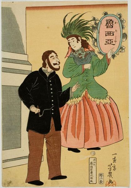 This print, by Utagawa Yoshiiku, was made using woodblocks, a technique known as Ukiyo-e. The process involves carving a design into wood, applying ink to the raised surfaces, and then pressing paper onto the block to create an image. The flat planes of color and bold outlines, typical of Ukiyo-e, lend the print a distinctive graphic quality. The layering of colors gives depth and dimension to the figures, showing a Russian couple in Western-style clothing. The woman holds a mirror, perhaps a comment on the perception, and consumption, of Western culture in Japan at the time. The level of detail suggests the skill and labor that goes into carving the woodblocks, and the way in which the prints were made. By considering its making, we can appreciate this print not just as a picture, but as an object deeply embedded in its time and place.