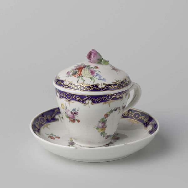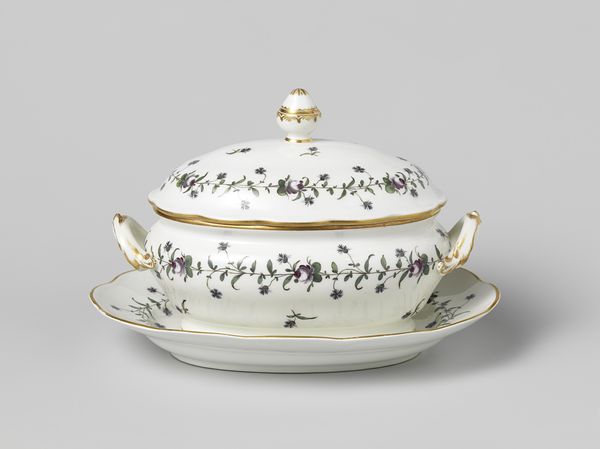 Editor: This lovely Terrine with Lid and Plate, made of earthenware and painted ceramic around 1760-1770 by the Ludwigsburg Porcelain Factory, exudes such a delicate, Rococo charm. The scattered floral motif is very pretty. What symbolism do you see within these painted elements? Curator: Ah, an excellent question. Rococo, remember, celebrated ornamentation and natural forms. This "strooimotief," as it's called, mimics a garden, a carefully constructed wilderness. But consider: are these botanicals painted realistically? No. They represent an ideal of nature, controlled and beautiful, reflecting aristocratic desires to dominate even the natural world. Editor: So, the very act of depicting these flowers becomes a symbol of power? Curator: Precisely. The rose, of course, often stands for love and beauty, but even its specific coloring matters. Notice how the pastel palette—the blues, yellows and purples-- soft, speaks to a specific sense of refined taste, of avoiding anything too garish or bold. What might the lemon on top suggest? Editor: Hmm, it adds a pop of vibrant colour, maybe a zest for life, or even luxury given lemons were less common then? Curator: Yes, and the lemon can symbolize freshness and purification. Combining all these symbols elevates the dining experience, turning every meal into a statement about wealth, taste, and the control of nature. Think about the continuity of representing the natural world, a constant reflection of our environment. Editor: This has given me so much to think about regarding Rococo's complexities. Thank you! Curator: It's a pleasure. There is always more to unearth when viewing our relationship to the history of symbols.