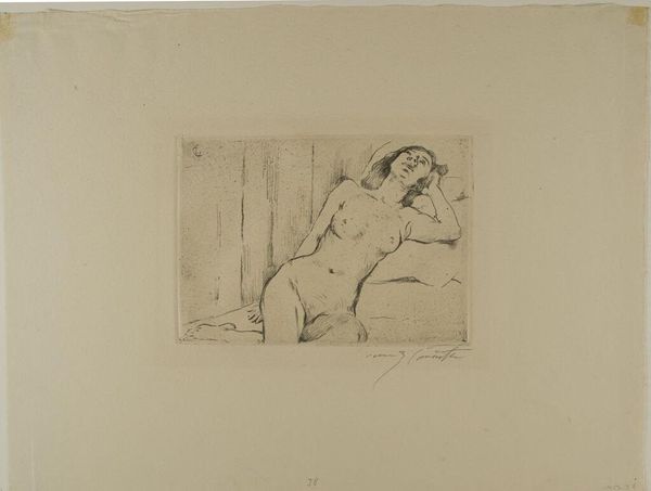 Editor: Here we have Emil Orlik’s "Nude Reclining Woman." It's a small print, almost intimate. What social narratives might this image engage with, given its display in a public institution like the Harvard Art Museums? Curator: Consider the history of the nude in art, often a symbol of power, beauty, or vulnerability, but seen through a male gaze. How does a museum mediate that history by displaying it, and whose perspectives are prioritized? Is it a celebration of the human form, or a perpetuation of societal norms? Editor: So the museum's role isn't just about preserving art but also about framing its meaning? Curator: Precisely. Every display is a conscious choice, reflecting certain values and potentially obscuring others. We need to critically examine whose voices are amplified and whose are silenced by these choices. Editor: I hadn't considered that aspect. It really shifts how I see the artwork and its place in the museum.