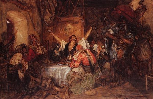 Curator: What a somber scene. Editor: It truly is. We’re looking at "The Tonsure of King Wamba," painted in 1894 by Joan Brull. It depicts the forced tonsuring, or shaving of the head, of the Visigothic King Wamba in the 7th century. Brull uses oil paint to bring a realism to this dark historical episode. Curator: My immediate impression is one of captivity, both physical and spiritual. The way light catches the pale face of Wamba on the bier as they forcibly cut his hair evokes images of ritual sacrifice, or even a foreshadowing of funerary rites. The dogs at the seated man's feet symbolize loyalty but are powerless to stop this violation. Editor: Precisely. The tonsure wasn't just a haircut; it was a symbolic stripping of Wamba's power and authority. The act rendered him canonically unfit to rule, removing him from the throne through what could be interpreted as religious manipulation and political machinations. Brull’s capture of this moment serves as an enduring indictment of unchecked power and its instruments of control. Curator: Consider how Brull uses visual cues – the stern-faced clergy, the opulent vestments against the bare stone walls, and the physical vulnerability of Wamba to deepen that indictment. We understand he wasn't merely removed; he was utterly undone, the very essence of kingship stripped from him. There's a very visceral response created through that depiction. Editor: Yes, there's an unsettling ambiguity present in this narrative. It begs us to question who is wielding power justly. Were the actions taken justified, or was it a politically motivated assault cloaked in religious piety? The painting invites critical thought about power structures and their potential for corruption within historical contexts but also mirrored in our current world. Curator: Indeed. It illustrates the ways symbolism can be weaponized. The image is not just a scene; it's an act of iconoclasm in reverse—a dismantling of the symbolic king to alter reality itself. Editor: And, ultimately, isn't that the question history continues to pose? The tension between narrative and power, perpetually re-enacted and re-interpreted. Brull has really seized something profound in this artwork. Curator: A haunting and unforgettable depiction, forcing us to confront uncomfortable truths about power and representation across the ages.