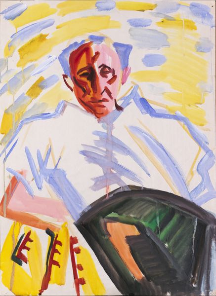 Here we have Edvard Munch's oil on canvas, "Self-Portrait with Striped Pullover." What strikes me first is the rawness of the brushwork. It's not about hiding the process but embracing it, letting each stroke carry its own weight, its own feeling. The yellow ground is so bright. It feels like it is pressing up against the figure, who is standing as if pinned to the surface. I’m really drawn to the area around the shoulders where the white shirt meets the yellow-green background. There's this incredible energy in the way the colors clash and blend. The paint feels almost scrubbed into the canvas. This creates a sense of tension, like the figure is struggling to emerge from the background, or perhaps sinking into it. Thinking about other artists who grapple with the self, I’m reminded of Paula Modersohn-Becker who also used the self-portrait to confront the realities of her life and times. Ultimately, art is about opening up possibilities, embracing uncertainty, and allowing for multiple readings and feelings.