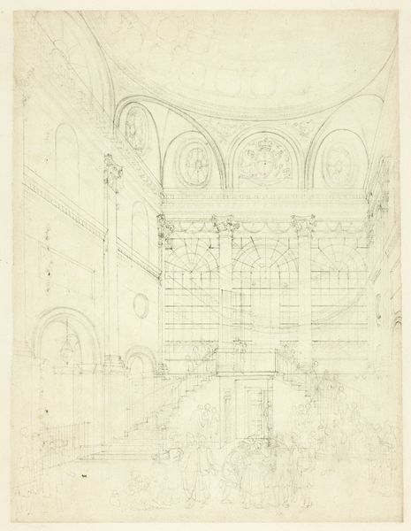 Augustus Charles Pugin made this drawing of St. Stephen’s Walbrook as part of his broader project of documenting London. Executed in pencil, the drawing emphasizes line, rendering the elaborate architecture of the church with precision. Consider the labor involved in this kind of painstaking representation. Each line meticulously placed, capturing the grandeur of the building's interior. Pugin wasn't just passively recording what he saw, but actively interpreting it. Note how the quality of the line varies: light and tentative in some areas, bold and decisive in others. The drawing serves not only as a visual record but also as a means of understanding and appreciating the built environment. This was at a time when London’s population and physical presence was exploding, demanding a new kind of visual accounting. Ultimately, this drawing invites us to consider the role of craft and skill in shaping our perception of the world. It challenges us to recognize the artistic merit in processes of careful observation and skilled execution.