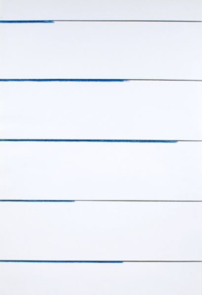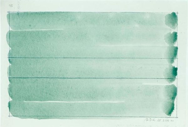 Curator: This is John Loker's "Three Horizons II," currently residing in the Tate Collections. There's something starkly beautiful about its simplicity. Editor: Immediately, I see landscapes flattened, almost imprisoned by those rigid lines. Is this a comment on our relationship with the natural world, the way we control and confine it? Curator: Loker often explored process and repetition. Notice how he varies the texture within each band, perhaps through subtle shifts in pressure or layering of materials. It reminds me of geological strata, or even agricultural practices. Editor: Perhaps. But I see a critique of power. Those horizons are segmented, categorized. The single black mark on the bottom—is that a symbol of defiance, or perhaps the exploitation inherent in such rigid systems? Curator: The physicality of the artwork, the mark-making itself, conveys information. The labor is evident. Editor: Agreed. It reveals not just the artist's hand, but also hints at larger societal structures. It asks us to question how we perceive and interact with the environment around us. Curator: Indeed, a thought-provoking piece on several levels. Editor: Yes, definitely something to keep thinking about.