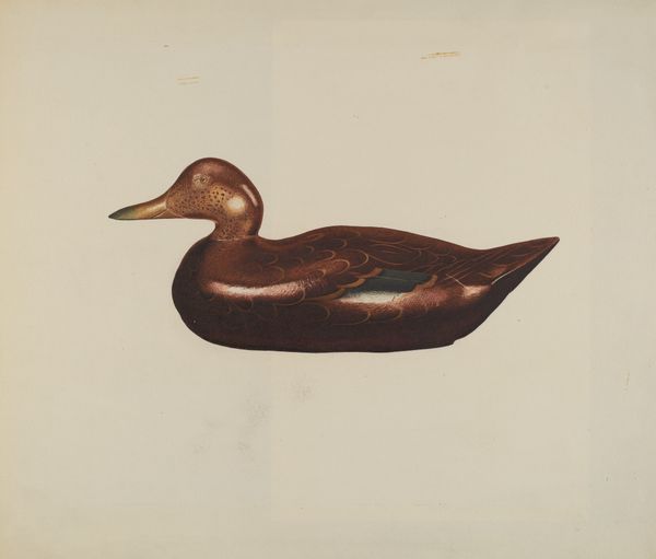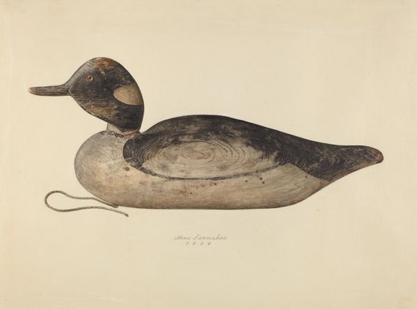 Editor: Here we have Selma Sandler's "Decoy" from around 1941, rendered in pencil and seemingly also wood. I'm struck by the stark simplicity of the image, how the utilitarian object is transformed by the artist's hand. What stands out to you about it? Curator: Well, let's start with the obvious: a decoy isn't *just* a static object, is it? It’s a tool, a manufactured item meant to participate in the economic and social system of hunting. Sandler’s work in pencil blurs that line – between pure art and mass-produced item. Editor: So you're focusing on its dual existence, art versus manufactured goods? Curator: Precisely! Consider the Depression-era context; this drawing forces us to acknowledge labor. Someone crafted the original wood decoy and Sandler, through her representation, elevates that craftsmanship. How does she force our eye to travel across the material? Editor: The tonal variations, the meticulous pencil work… the light really catches those details. And the choice of drawing…it feels very immediate and hands-on. Curator: Yes! The labor is evident! There's a transparency here – we see the making, the artistic labor. Do you think Sandler romanticizes it, or challenges the traditional art boundaries, perhaps even showing how these things can overlap? Editor: That's a great point; perhaps it's a little of both. It's making me think about the value we place on different kinds of work, whether it's artistic or functional. Thanks. Curator: Absolutely, it makes you consider that all works reflect cultural conditions of art.