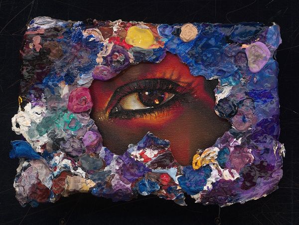 Sandra Chevrier’s *La Cage, le papier pleure* is a mixed media piece, and it looks like she’s using gold leaf, collage, and oil paint. It’s a real process painting; you can see the history of how it was made. The surface is totally built up, collaged with comic book fragments that give it this wild texture. Then, like she’s breaking through, is this hyper-realist portrait. The mouth and eyes are painted so precisely, but they're set against this chaotic background. Check out the edges where the portrait and the collage meet. See how the gold leaf is torn, revealing the comic book pages underneath? It’s like a mask being peeled away, or maybe a struggle to break free. It reminds me of Sigmar Polke and his use of everyday materials. He used to use cheap, patterned fabrics as a canvas, incorporating the readymade design into his paintings. There’s a similar interest here in collapsing high and low, beauty and chaos. I love how Chevrier embraces the mess, letting the process become part of the final image. It feels honest.