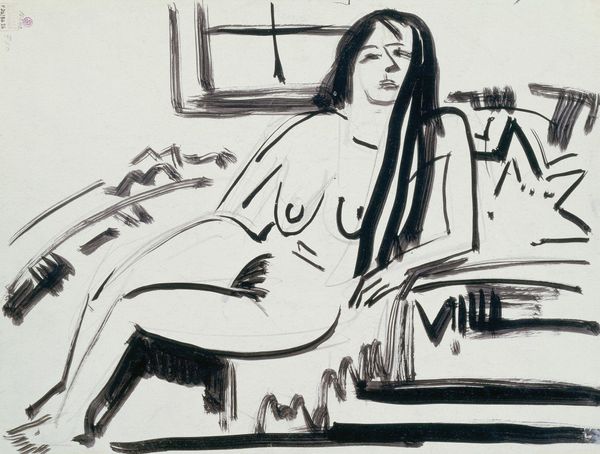 Editor: We’re looking at Ernst Ludwig Kirchner’s "Two Seated Women in Studio" from 1912, rendered in ink. There's a raw, almost frantic energy in the lines. What stands out to you in terms of its creation? Curator: I immediately notice the emphasis on the process, the visibility of the artist’s hand. The medium itself – ink – lends to the sketch-like quality, challenging any notions of polished, finished art. Kirchner here uses materials in a direct way; think of it as honest labor transferred to paper. Editor: Honest labor, interesting! The loose, scratchy lines definitely speak to the immediacy. Curator: Exactly. And the very choice of materials implies a commentary on the traditional expectations surrounding the "nude" genre. Are we looking at mere representation or something else? What is he *doing* with this subject, the means by which he renders them? Editor: You mean like, is he making a comment on art’s function, through both form and what is depicted? Curator: Precisely. This era saw shifting ideas around mass production, industrial materials and manual production methods. It could be an argument *for* manual work. Even a type of intimacy… the labor being evident *is* the piece. Editor: I hadn't considered that. So, Kirchner is not just depicting figures; he's highlighting the act of creating, the human touch in art. Curator: Exactly. It's less about the subject and more about the means of production and their relation to art’s market. What can a simple choice like ink, over oils, say? Editor: This makes me look at it in an entirely new way, valuing the process and social message embedded in this seemingly simple ink drawing. Curator: Indeed, hopefully you and listeners consider these things now more.