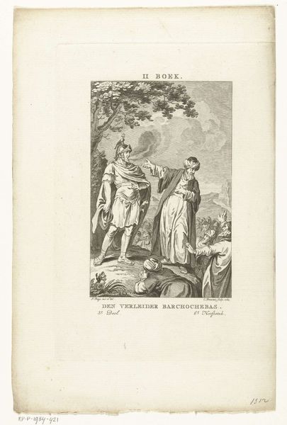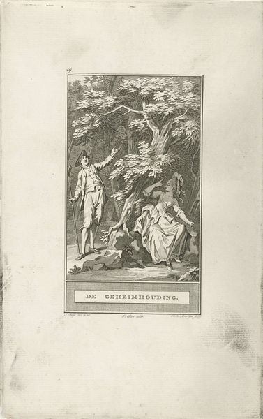 Curator: Welcome. Before us, we have Theodoor Koning’s “Voorspelling van Agrippa's geluk,” or “Prediction of Agrippa’s fortune,” dating from 1783. It's a fascinating engraving currently held at the Rijksmuseum. Editor: Immediately striking! There's a potent mix of tension and foreboding captured so well in monochrome. It reminds me of classical stagecraft. Curator: Koning crafted this engraving at a time of social upheaval and philosophical inquiry. Consider the late 18th century’s fascination with fate, luck and fortune as popular pastimes and superstitions, further informing Koning's Neoclassical approach. This is most evident through the medium, a reproducible print, making what would otherwise be unique available to a wider consumer market. Editor: And observe the composition—the gaze directed sharply, contrasting dramatically with the almost dejected posture of Agrippa leaning against a tree. Note too the classical architectural backdrop; how might it symbolize fate itself? It frames the characters’ story into something monumental. Curator: Indeed. The linear quality achieved via the engraving, meticulously cut into a metal plate and printed, mirrors the era's emphasis on rationality and order that defined Neoclassical print production, a style aimed at promoting virtue in public. One must consider how the print was distributed, too: in books, and sometimes even on the walls of private homes! Editor: Semiotically, the pointing figure signifies agency and impending action, set against the neutral background of rigid order in a perfect classical garden and temple in the distance, conveying impending doom. Curator: What I appreciate most is how it takes this notion and places it in the hands of common citizenry through consumer availability of mass produced media such as books. Art during times such as this one are paramount in recording human behaviour. Editor: This examination underscores its historical importance, doesn’t it? Understanding these historical processes is essential to fully grasp the print’s original power and message to audiences from a period gone by. Curator: Yes, exploring Koning’s engraving in its material and cultural moment deepens its narrative resonance within both the artist's hand and a philosophical context in a transformative epoch. Editor: A brilliant intersection of artistry, message, and fate—indeed. Thank you for your valuable insight.