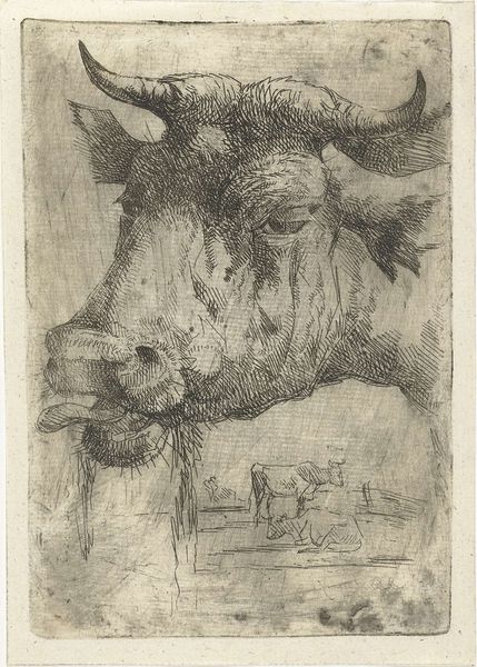 Dirk Dirksen created this etching, called "Kop van geit", or "Goat Head" in Dutch, using delicate lines to capture the animal's features. Dirksen lived and worked during a time of significant social and economic change in the Netherlands. The Dutch Golden Age, characterized by prosperity and artistic innovation, had long passed, and artists like Dirksen found themselves navigating a different landscape, one in which the representation of rural life and animals held particular appeal. Dirksen's choice to portray a goat is not without cultural significance. Goats often symbolize virility, stubbornness, and independence. How might these qualities reflect broader societal attitudes toward nature, labor, and freedom during the 19th century? What does it mean to single one animal out? The intense gaze, the strong horns... Dirksen seems to ask us to consider the animal's unique identity. Through his careful rendering, we are invited to contemplate the complex relationship between humans and the natural world, and perhaps even to question our own place within it.
