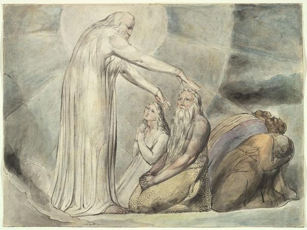 Editor: So, this is William Blake's "Then the Lord Answered Job out of the Whirlwind." The dramatic swirl and the figures struck with awe create a powerful sense of the divine. What symbols stand out to you? Curator: The whirlwind itself is a potent symbol, Editor. It's not just a storm, it's a visual metaphor for divine power and unanswerable questions. The figures cowering beneath it reflect humanity’s confrontation with forces beyond our comprehension. Notice how Blake renders God's form emerging from it. Editor: Yes, the way God's figure is almost integrated into the whirlwind is striking. Is it meant to show His omnipresence? Curator: Precisely! It suggests that the divine is not separate from the natural world, but intimately intertwined with it. God's presence is literally the storm, a reminder that even in chaos, there is a higher order at play. Editor: I hadn't considered the storm itself as a symbol of the divine, that is a new perspective for me. Curator: Blake challenges us to see beyond literal interpretations, uncovering how the imagery carries emotional and psychological weight that resonates across time.