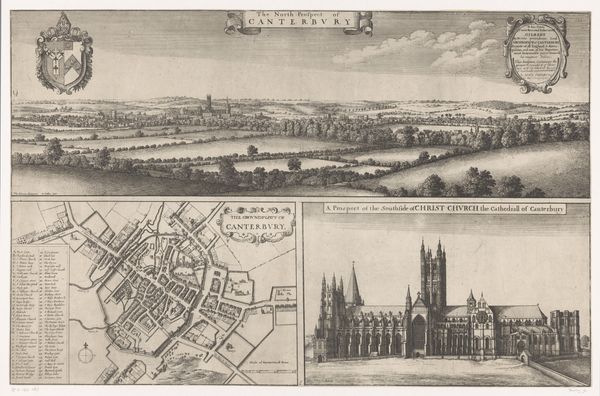 Curator: Before us, we have a remarkable engraving by Johannes Kip from around 1720, titled "A Prospect of Westminster & A Prospect of the City of London," offering a panoramic view of London. Editor: It’s fascinating. It feels almost like a stage set, the way the city unfolds horizontally. So much is suggested with such deliberate restraint. Curator: Absolutely. Kip's technique really highlights the textures and density of the city. Think about the labor involved, etching these minute details onto a copper plate, each line precisely placed to evoke brick, water, sky... the sheer scale of it all points to a major workshop production. Editor: Indeed. I'm drawn to how St. Paul's Cathedral dominates the skyline. It serves as a clear symbol of the city's religious and economic power, rising above all other structures, really hammering home the strength of the Church and the Crown. And those little boats on the Thames, so similar in form they speak of the bustling trade running through the heart of London. Curator: Those boats weren't just about trade. They signify the lifeblood of the city, the exchange of goods, ideas, and people flowing along the river. This was an era of significant transformation. We're looking at a commodity, really, a desirable representation of urban prosperity to be acquired and displayed. Editor: Yes, and Kip strategically positions allegorical figures in the sky above each city view. These angelic figures perhaps are more than mere decoration. They evoke a sense of divine favor upon these centers of commerce and government, subtly implying God's blessing on London's expansion. Curator: It is quite something to see how labor and craft manifest into social capital. But consider also how prints like these circulated and contributed to forming a collective sense of identity during a pivotal phase of London's development. Editor: It truly serves as both historical document and potent symbol. It provides a means to map London in its burgeoning era. I’m reminded that the images were not just meant for geographical reference. Curator: I agree. This print invites us to ponder London's position within both a material and an allegorical space. Editor: Ultimately, Kip's "Prospect" offers a window into how London presented itself to the world. We, too, can now observe this version.