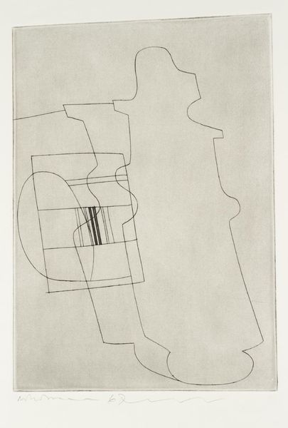 Curator: Jasper Johns created this work, "Green Angel [trial proof]," in 1991. It appears to be an ink print or drawing featuring stark, abstract geometric forms. Editor: My initial response is that it's somewhat unsettling, almost aggressively abstract. The sharp lines and ambiguous shapes create a feeling of tension. Curator: Indeed. Given the context of Johns' other works, specifically his incorporation of everyday objects and signs, it begs the question: what systems of production informed this print's conception? Is it a study for something larger, or a commentary on printmaking itself? The labor involved seems very intentional. Editor: Perhaps. But I'm drawn to the way these forms interact—the juxtaposition of rounded edges against sharp angles. It creates a visual rhythm that holds my attention even without any immediate referent. The line work, while simple, is incredibly deliberate. Curator: But can we ignore the historical implications? Consider the social environment of the early 1990s, the rise of mass media and technological reproduction—how does that influence the reception of this work as a "trial proof"? Does the work critique or embrace these new modes of making? Editor: I understand your impulse to contextualize, but the impact comes from its pure form. Note how the figure rises from a relatively grounded base, almost defying gravity with its asymmetrical balance. This to me suggests deeper symbolic meanings. Curator: Yet even this "simple" drawing is itself embedded within a network of material and labor. The choice of ink, the paper stock, the printing process – each one carries meaning. Are these readily available or bespoke choices? Editor: I see your point about materiality, but ultimately, "Green Angel" achieves a rare synthesis of line, form, and space. This allows viewers to project their interpretations onto it, creating meaning regardless of production histories. Curator: For me, thinking about artistic process enhances its cultural value, rather than distracting. This helps reveal why this artwork remains so vital. Editor: Well, I'm inclined to remain here for a while longer to appreciate Johns' angular harmony and its ambiguous nature. I am compelled by this complex yet sparse image.