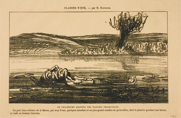 Curator: We’re looking at a lithograph by Honoré Daumier from circa the 19th century. The title roughly translates to "Who!… these Parisians who come to bathe in our river… do they have to be filthy in Paris to need to wash like this every summer?" Editor: Well, my first impression is that this piece seems almost grotesque, doesn't it? The stark contrasts, the exaggerated features—it's rather jarring, yet there's something compelling in its bold composition. Curator: Exactly, Daumier was a master of social commentary. He used caricature to critique the bourgeoisie, highlighting what he saw as their ridiculous affectations and their impact on broader society. Editor: So, it's not merely observational, but rather a pointed critique aimed at disrupting social norms. Look at how he uses line to create a sense of almost frantic energy. Curator: Absolutely. Consider how his work fits within a broader context of social unrest. The July Revolution had occurred just decades earlier, and the print media provided a crucial outlet for voicing dissent and shaping public opinion. Daumier uses these figures—and the bathers in the river—as proxies to point a finger at the Parisian elites encroaching on and judging rural life and custom. Editor: True, it certainly provokes a reaction. One wonders about the contemporary reception to this image. Did viewers recognize themselves in his depictions, or did they dismiss it as an overblown exaggeration? The water is so present as an engulfing compositional component that makes a semiotic reading so direct, yet rich. Curator: Given his repeated run-ins with the authorities and even imprisonment for his work, I imagine his critiques hit quite close to home for some. He used his art as a tool for political resistance, positioning himself as a voice for the marginalized and disenfranchised. Editor: His commitment to highlighting social inequalities feels incredibly relevant even today. After seeing Daumier’s vision it feels imperative to use analytical rigor to fully understand the artwork through social critique and semiotics. Curator: By delving into his lithograph, it becomes quite apparent just how complex the relationship between art and politics, representation and reality.