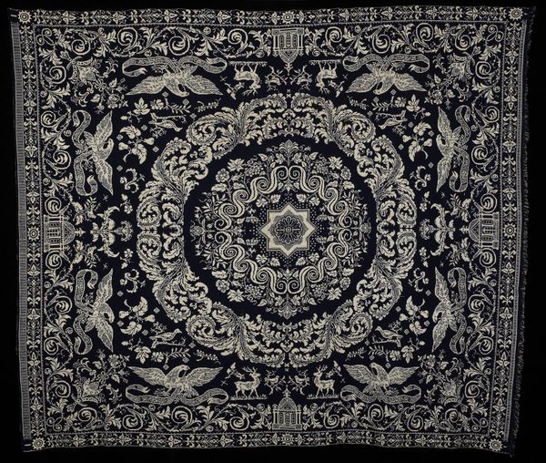 Curator: Here we have an exquisite woven coverlet from 1828. The maker, Mary Ann Wood, even inscribed her name and the date within the design itself. Editor: My goodness, it's so meticulously patterned! It feels almost dizzying, like staring into a field of optical illusions. Curator: The contrasting colors, most likely indigo-dyed wool on a cotton base, really make the motifs pop. Notice the abundance of floral and geometric forms. Editor: Yes! It's like she took all the sweetness of a garden and then organized it with mathematical precision. I see buildings as well... what are they? Curator: I see what you mean... very simple outline structures are placed among the flowers, almost overshadowed by the abundant stars. In nineteenth-century America, such images were important representations of burgeoning national pride and served to tie domestic spaces to broader national narratives. Editor: So it's not just decorative but patriotic! Knowing it’s 200 years old changes my perception; I imagined somebody under that coverlet dreaming of…America, of hope, of home. It seems so personal, even with those patriotic elements. Curator: Absolutely. Coverlets like these were significant markers of identity and skill, expressing a woman’s creativity, industriousness, and place within her community. Even the act of weaving itself can be read as a cultural symbol of interconnectedness. Editor: So the very act of creating such an intense pattern… reflects that interconnectedness you mention, like how each thread relates to the larger piece. And I'm fascinated by the inversion: we create coverings for intimacy and domestic space to find something outwardly patriotic! Curator: That’s a lovely way to phrase it. It invites reflection on how personal and collective identities intertwine. Editor: What a stunning collision of artistry and symbolism. I am thankful to witness and reflect on its layered patterns. Curator: A potent reminder of the unseen hands that wove our past, stitch by stitch.