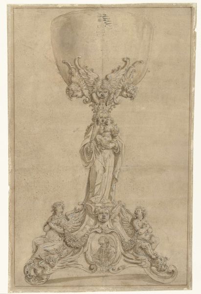This is an anonymous design for a fountain rendered in pen and ink. The drawing shows a fountain adorned with sea creatures and topped with a vase overflowing with foliage. Consider for a moment the role of fountains in society. Historically, fountains have been gathering places, status symbols, and sources of sustenance for the public. But how does access to resources like clean water intersect with power? Who gets to partake and who is excluded? Is nature here a symbol of the bounty of the earth or its exploitation? Water spouts from the mouths of the fish, blurring the line between control and chaos. This tension speaks to the relationship between humanity and nature. In this drawing, we see the natural world and the constructed environment coexisting, a reminder of our complex relationship with the environment. What does it mean when the natural world is harnessed for human use?