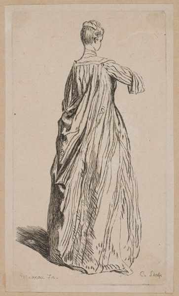 This drawing, "Standing Woman, Seen from an Angle from the Back", was created by François Boucher in the 18th century. Boucher, a favorite painter of Madame de Pompadour, embodies the Rococo era's focus on ornamentation and the aristocracy. Here, a woman, likely of the upper class given her elaborate gown, is depicted from behind. Her posture and dress suggest a narrative of courtly life, replete with its social expectations and gendered performances. Consider how her dress, with its voluminous fabric, both empowers and constrains her movement and presence. The folds and shadows of the fabric hint at the luxury afforded to women of her status, yet simultaneously, the way her body is obscured raises questions about identity and individuality. Through the lens of contemporary feminist theory, we might ask: how does Boucher's work negotiate female identity? What is revealed or concealed in this representation, and how does it echo or challenge societal norms? The drawing invites us to consider the multifaceted roles women played in the 18th century.