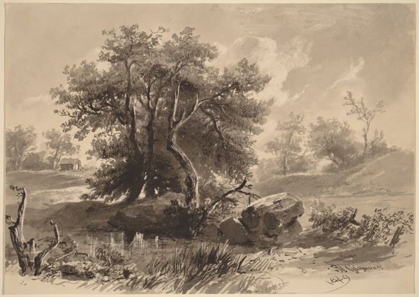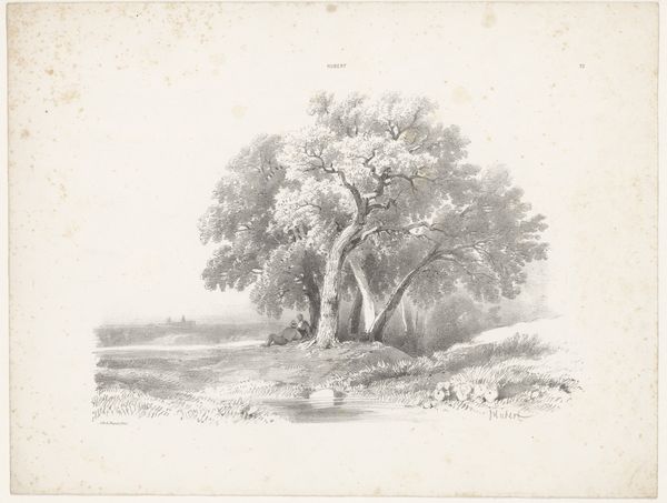 Editor: This is James Duffield Harding’s “Abele and Oak, from The Park and the Forest,” a lithograph from 1841. The detail is incredible; you can almost feel the breeze rustling through the leaves. What strikes you most about this piece? Curator: What stands out to me is how this serene landscape actually reflects England’s changing relationship with nature during the industrial revolution. The Romantic movement, of which Harding was a part, emphasized emotion and individualism as a revolt against aristocratic social and political norms and the rationalization of nature. Editor: So, a seemingly peaceful scene is, in a way, a political statement? Curator: Precisely! Consider the deliberate focus on the trees – the abele and the oak, native species – as a potential symbol of national identity. This was a time when the English countryside was rapidly transforming, impacting rural communities and traditional ways of life. What do you notice about the human presence in this landscape? Editor: It feels… incidental. A few figures, small in comparison to the trees, almost like they’re passing through. Curator: And that positioning is key. It asks us to question the relationship between humanity and nature, prompting us to consider who has access to the land, who benefits from it, and what the costs of progress truly are. Editor: That completely reframes how I see the image. I was initially drawn in by its beauty, but now I realize it carries a much deeper, more critical message. Curator: Exactly. Art like this compels us to investigate not just what we see, but why we see it that way and who shaped our perspective. Editor: This has opened my eyes to the social context behind the landscape genre in unexpected ways!