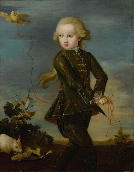 Editor: Here we have Velázquez’s “Prince Balthasar Carlos as a Hunter,” painted in 1636 using oil. The young prince, perhaps seven years old, seems a bit melancholic despite the hunting garb. What stands out to you? Curator: Notice how Velázquez uses symbols to subtly communicate power and legitimacy. Hunting was an activity strongly associated with royalty and nobility. Look closely at the dogs. Editor: Yes, there are two distinct breeds! What significance do they have? Curator: Exactly! One is a stately hunting dog, alert and attentive, and the other, a more docile breed wearing a white cap, conveys the taming of wild nature under royal authority. Even the muted palette is carefully chosen; it’s not merely about realism. How does that subdued color scheme impact the reading of the piece for you? Editor: It lends an air of seriousness, perhaps reflecting the heavy responsibilities Balthasar would have carried as heir to the Spanish throne, don't you think? It also keeps the viewers eye on Balthasar and the hunting dogs. Curator: Precisely. Color here reinforces social messaging. Each visual element layers meaning. He's not just a boy; he's a carefully constructed icon of royal expectation. Do you think the backdrop plays into this concept? Editor: The blurred mountains almost fade into the background. I can see it adding this endless landscape, signifying his, almost limitless power to preside. It's pretty insightful! Curator: Right! Next time, really look for ways that meaning hides in plain sight!