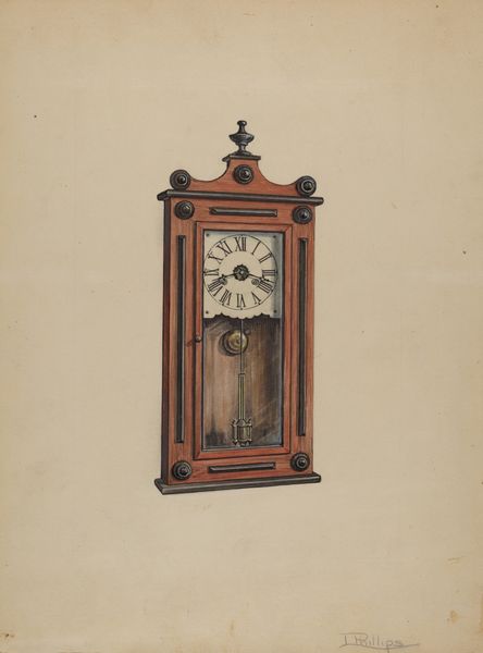 Curator: Here we have Richard Taylor’s "Mantle Clock," dating to around 1938, rendered in watercolor. What strikes you immediately about this piece? Editor: The stillness. Even though it depicts an object intimately associated with the passage of time, there’s a profound sense of quiet and expectation about it. Curator: Interesting. Let's delve into the composition. Notice the meticulous detail in the rendering of the wood grain, the precise rendering of the clock face. The artist gives us not only a representation but an experience of the texture. Editor: Indeed. This work appears against a socio-historical backdrop where labor was valued but also easily commodified. So, what does it mean for the artist to isolate this single "clock," to capture its essence while broader economic "times" saw its worth quantified? This may be a reflection of anxieties about industrial changes happening during the Great Depression in the U.S. Curator: That's compelling. Structurally, observe how the geometry plays. The clear lines and right angles create a sense of stability, yet the gentle curves at the clock's apex soften the overall effect. What are your impressions of these compositional choices? Editor: I see these stylistic choices as indicative of interwar anxieties. How "on the clock" many people suddenly felt, but perhaps how removed from previous iterations of craftsmanship that same public felt too, is visible here. It’s like this single object is weighted with expectations. Curator: It invites layered interpretations. We have explored both formal elements of line, texture, color as well as delved into historical interpretation of time during industrial boom in America. Thank you. Editor: Yes, art gives us an entry point to those explorations of life at various crossroads. This drawing reminds us to be critical when interpreting artwork. Thank you.