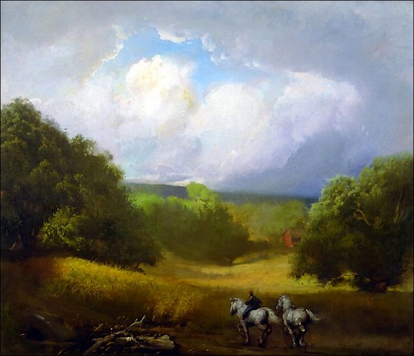 Kent Monkman’s “Reincarceration” presents us with a vision rendered in oil paint, where history and myth collide. The sky is vast, brushed with strokes of grey and blue, setting a stage for a narrative that's both epic and intimate. Monkman uses traditional painting techniques to weave a story that feels both familiar and dreamlike. Look at how the figures gather near the water, their forms alive with movement against the backdrop of a landscape marked by both natural beauty and the decay of abandoned cars. The paint is applied in layers, creating a depth that pulls you into the scene. Notice the texture, especially in the foliage, where the dabs of paint create a sense of lushness and wildness. That smoke rising, its hazy tendrils blurring the line between the material and the ethereal, embodies the complexity and open-ended quality of the work. Like the Hudson River School painters, Monkman captures a sublime landscape. But unlike them, he populates it with figures who reclaim the narrative, suggesting that history is never a fixed thing but rather a process of continuous reinvention.