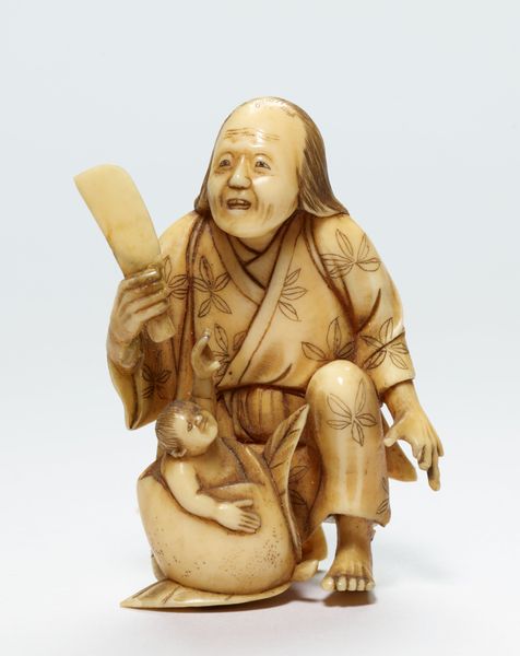 Editor: We're looking at "Musician at New Year," an ivory sculpture from the late 19th century, attributed to Seiichi. It's so tiny! The detail is incredible, from the little drum he's holding to the pattern on his robe. I'm struck by the intricacy. What compositional elements stand out to you? Curator: The sculpture immediately presents us with the inherent qualities of its materiality and form. Notice the creamy, almost luminous quality of the ivory itself. The artist, Seiichi, has exploited this to create a sense of subtle gradation and light play across the figure. How would you describe the distribution of mass within the sculpture? Editor: It seems bottom-heavy because he's sitting. The objects around him make the base look pretty solid. Curator: Precisely. Observe how Seiichi uses this grounded base as a foundation for the more dynamic, almost whimsical elements like the musician's raised fan and the smiling countenance. The textures also offer compelling reading: The smooth planes of the face and hands versus the carved fabric folds. Do you discern any inherent tension arising from this interplay? Editor: The smoothness kind of makes the textures pop more, yeah! It does create contrast. Curator: Yes. That controlled contrast elevates certain qualities within the figure. His positive, calm demeanor wouldn't pop if he were also clothed with plain material. Think now about the sculpture’s overall structure as pure, formal arrangement – detached from external context. Is the work self-contained? Editor: That’s interesting. I guess paying closer attention to these basic elements reveals more intention than I initially thought. Curator: Absolutely. By engaging in rigorous analysis, the inherent complexities and intentions emerge, enriching our perception. Editor: I never considered approaching a work in that way. I definitely learned more by focusing on what's in front of me and describing what's there.