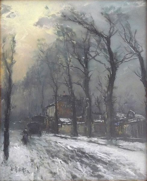 Curator: This is "Paris, Quais de la Seine sous la Neige," an oil painting attributed to Pierre-Jacques Pelletier, although the date remains unknown. It’s clearly evocative of the Impressionist style. Editor: Wow, it’s beautifully bleak! I mean that in the best way. It’s the kind of day where the city sort of disappears, becomes almost monochrome, and yet, there's a quiet loveliness to it. Like a charcoal drawing, almost. Curator: Note how Pelletier captured the quays in what appears to be a flurry of activity but, equally, as a social space connected by production: a bridge that seems to emerge out of the industrial infrastructure contrasts the natural snowy setting. It invites reflection on the city's industrial backbone versus lived experience. Editor: You’re so right; the bridge! It sort of looms in the background. For me it is more poetic – I am almost getting a fairytale-like feel, almost Hans Christian Andersen, particularly with the muted palette; it softens what could otherwise be a harsh scene. Curator: What strikes me is the use of oil paint to seemingly obscure architectural boundaries but, really, in its tactile, visible execution, calls attention to the making of the scene we look upon. It isn’t that different to a photograph capturing material transformation across social space and through changing technologies. Editor: It is quite the achievement for a snowy Parisian scene! Almost captures silence somehow, yet hinting at movement, just below the surface of the river Seine! Looking at the city in slow motion - it invites one to meditate on our own passage through time... Makes you think, doesn’t it? Curator: Yes, absolutely. Through Pelletier's piece, one gets a palpable sense of place and material use—a layered historical document about resource use and economic change through its style, medium, and subject matter. Editor: I shall see snow-blanketed Parisian quays with a bit of different, knowing magic from now. Thank you!