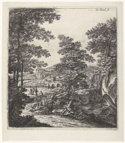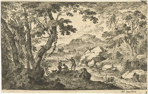 Editor: This is Jan Both's "The Ox-Cart, from Upright Italian Landscapes," created sometime between 1638 and 1652. It's an etching on paper. I’m really struck by the contrast between the detailed foreground and the more hazy background; it feels very theatrical, almost like a stage set. What do you see in this piece? Curator: The “stage set” feeling is astute. Landscape, especially Italianate landscape, evolved as a genre laden with symbolism. Look at the figures; what feeling do they evoke? These weren't simply picturesque scenes. The staff held by the central figure might point towards pilgrimage, connecting earthly travel to spiritual journey. The ox-cart, in its laborious task, perhaps references the struggles of human existence. Editor: That’s interesting; I hadn’t thought of the individuals in that way, I was looking past them at the trees and mountains in the background. So even ordinary figures were loaded with meaning? Curator: Precisely. And consider the light – it's not just atmospheric. The specific placement can highlight virtues or spiritual truths. For example, does the path to the town symbolize opportunity, hope, or a perhaps something more ambiguous? Even the very act of representing Italy during the Dutch Golden Age reflects cultural aspirations and perhaps, a touch of nostalgia or even longing. Editor: So it's not just a pretty scene, it’s about cultural memory and ideals being constructed? Curator: Absolutely. Both used the landscape not just to represent Italy but to communicate Dutch ideas, ideals and desires through carefully chosen symbols. Consider how easily recognizable landscape became symbolic shortcuts over time. Editor: That really changes how I see it! It makes it feel much more deliberate. Curator: Indeed. It's a beautiful illustration of how landscapes carry within them complex narratives if you can understand the iconography of the time.