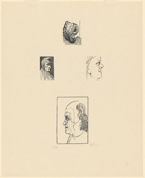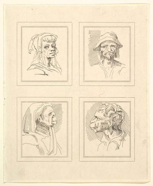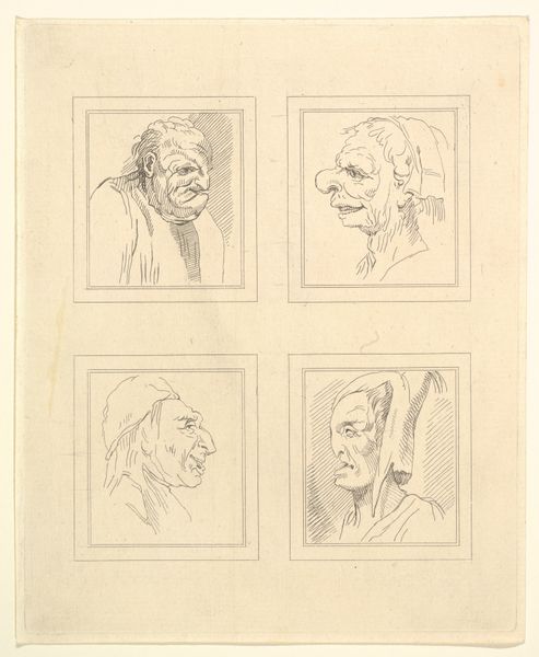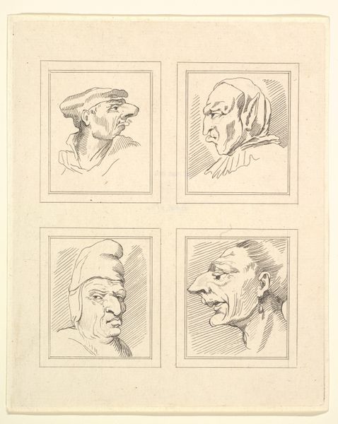 Curator: Standing before us is "Four Heads (from Characaturas by Leonardo da Vinci, from Drawings by Wincelslaus Hollar, out of the Portland Museum)," an engraving by Wenceslaus Hollar dating back to 1786. Editor: My initial impression is one of discomfort and fascination. There's a starkness to these grotesque features that is somehow both repulsive and incredibly engaging. Curator: Hollar's work exists as an appropriation of da Vinci’s caricature studies. Let’s consider how artists adopt and reimagine existing works across different socio-historical contexts. The social satire and power dynamics implicit within each head reflect the norms and hierarchies prevalent during both artists’ eras. How does this lens invite us to engage with representation in contemporary society? Editor: Right. The labor that went into this piece as an engraving needs recognition. I see lines etched so precisely to give form to each caricature, likely using a burin. Engraving wasn't cheap or easy. Consider, too, who the intended audience might have been – presumably, wealthy consumers. Did it serve a political purpose through accessibility, or merely fuel bourgeois sensibilities by mocking particular physiognomies? Curator: That question of labor and intended audience speaks volumes about its historical placement, I think. Who is allowed to be "caricatured," and who is doing the caricaturing? This resonates through time, bringing forward the original power relationships to ask: who does representation serve, and at what cost? This directly speaks to social commentary on privilege and exclusion. Editor: So, if these faces originally belonged to studies by da Vinci, how much are they simply mimicking, versus serving a representational, localized reality here through the engraver's skill and agency in choosing certain subjects, or emphasizing certain details? Curator: Absolutely, because, from the vantage of today, these images call attention to how easily visual representations, filtered through different contexts, are utilized to classify and stereotype. So let’s not stop short, instead we should critique the system where those stereotypes came to form. It helps deconstruct what the image presents in its simple forms. Editor: Looking closely at the textures and shading rendered via precise engraving lines also really grounds the idea that these aren't just images; they're labor materialized, commenting on its specific social context. Curator: It prompts us to reflect on whose perspectives get amplified. Whose are silenced through such displays, whether originally or by its continuation throughout history? It compels critical self-reflection for anyone encountering the artwork and invites necessary dialogue on these issues within present times. Editor: So, as a method for challenging these images, recognizing and celebrating both craft and its social underpinnings is essential, helping provide tangible insights into labor practices as resistance. Curator: By contextualizing "Four Heads," we not only acknowledge its complex layers but simultaneously interrogate art history’s role in shaping identity, power and how we move beyond passive consumption of it into active understanding and advocacy.