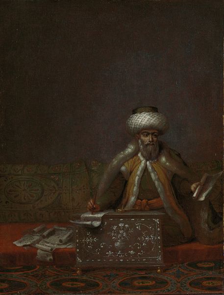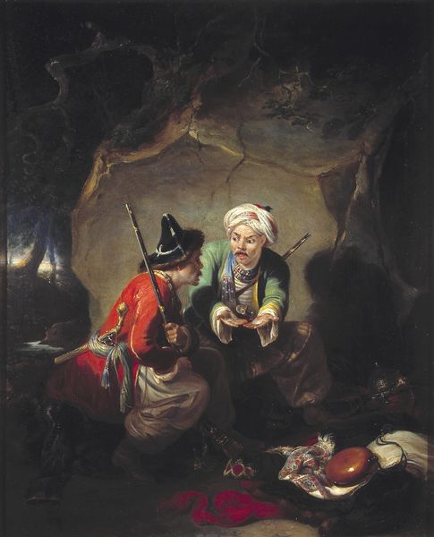 Editor: This is Theodore Lane’s painting, Enthusiast, sometimes called ‘The Gouty Angler’. It’s quite a dark scene, yet there’s something very cozy about it. What stands out to you? Curator: Notice how Lane uses the fishing rod itself – extending it from the foreground to the back – like an arrow pointed towards some unreachable goal, a longing. What might the symbolic meaning of this pursuit be, for a man of that era? Editor: Perhaps a yearning for simpler times, away from industrialization? Curator: Precisely. The objects around him – the wine, the book, the ornate fireplace – create a sense of domesticity. But even these suggest isolation, as if he’s trapped within his own comforts. Do you sense a tension? Editor: I see it now, the warmth is overshadowed by a kind of melancholy. Curator: Yes, the painting becomes a meditation on aging, perhaps, and the bittersweet reality of finding solace in a world that’s changing too quickly. Editor: That's fascinating; I hadn't considered the painting in that light. Thank you!