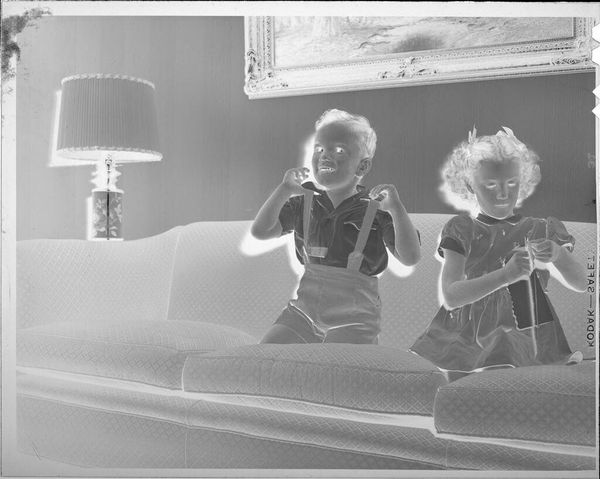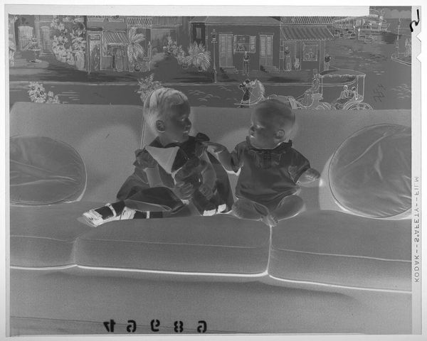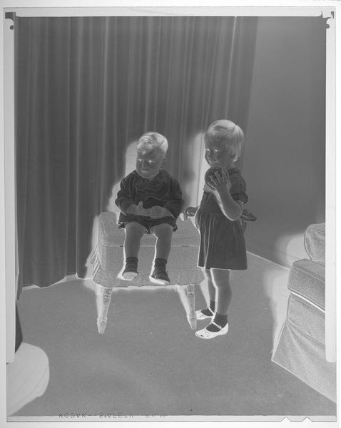 Editor: In this photograph by Martin Schweig, "Untitled (very young girl and baby boy posed sitting on floor looking at toy mailbox)," we see two children absorbed in play. It strikes me as a very intimate scene. What symbols jump out at you? Curator: The "Playskool Postal Station" is intriguing. Mailboxes represent communication, but here, geared towards children, it suggests early socialization and perhaps even societal expectations around correspondence. It speaks to how we teach children to connect. Editor: So it’s not just about play, but also about learning societal norms? Curator: Precisely. The image captures how children learn roles through imitation and toys become instruments of cultural transmission, reflecting our values. It’s about initiating them into the world. Editor: I hadn't considered that. It's fascinating how a simple toy can carry so much cultural weight. Curator: Indeed, everyday objects often hold deep symbolic meaning.