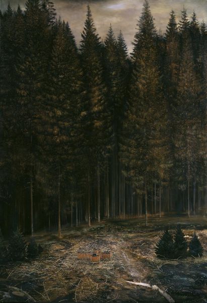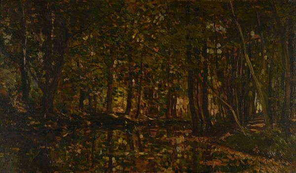 Curator: Before us is "Mystieke paden': bosgezicht," which translates to "Mystical Paths: Forest View," a 1907 oil painting by Gust van de Wall Perné, housed here at the Rijksmuseum. Editor: It immediately evokes a sense of isolation. The monochromatic palette, the way the mist obscures the depths of the woods, makes me feel quite uneasy, like I'm trespassing somewhere I shouldn't be. Curator: Notice how Perné employs Impressionistic brushstrokes, but also blends that with Symbolist themes, using the forest not just as a landscape, but as a mirror for inner experience, for the subconscious. Forests are powerful symbols across cultures. What do you think he might be trying to convey? Editor: That's interesting to consider within the context of its time. Early 20th century Europe saw rising anxieties around industrialization and urbanization, so the forest, as a motif, may represent a yearning for something untouched, authentic, even a critique of encroaching modernity. Perhaps these ‘mystical paths’ signify a retreat from societal constraints? Curator: I agree that a certain romanticizing of nature plays a role here. However, forests, and the darkness they inherently imply, also stand for danger, for trials, even initiations. They are thresholds. Notice that very faint impression of deer in the distance, are those the ghosts of the past, beckoning us deeper in, deeper into this dreamlike realm of half perceived reality? Editor: Or are the deer stand-ins for some oppressed group or minority hidden in the woods? After all, history has always excluded certain populations and identities from its primary narratives. Perhaps it is Perné alluding to histories deliberately obscured and nearly erased from public view. Curator: Perhaps Perné wanted the viewers to supply that answer, or find their own answers within their own belief system and emotional knowledge of art and history. This painting asks more questions than it answers, I think. Editor: Indeed. This work truly illustrates how artistic expression can serve as both a reflection of societal concerns and as an opening for multiple interpretations about collective historical experiences.