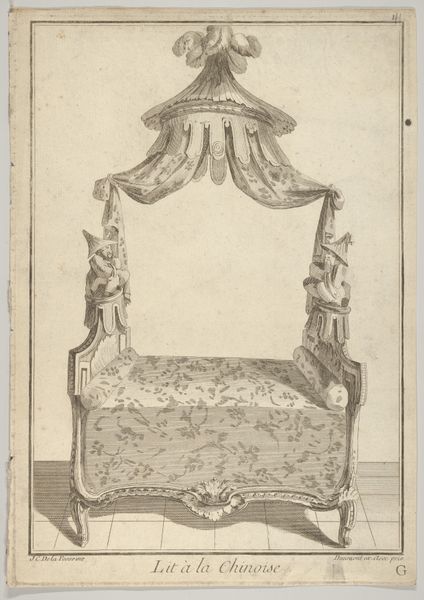This line engraving of a bed, or 'Hemelbed met bellen,' was made by Nicolas Dupin in France, sometime around the 1780s. The image creates meaning through its detailed visual codes, showcasing the opulence and luxury associated with the French aristocracy of the late 18th century. Note the elaborate ornamentation, the flowing draperies, and the elevated structure of the bed itself; these features speak to a culture deeply invested in displays of status and wealth. It’s crucial to remember that this artwork exists within a specific social and institutional history. France at this time was on the brink of revolution, and the extravagance depicted here stands in stark contrast to the growing poverty and discontent among the lower classes. You might investigate journals, letters, and even inventories of the period to better understand the cultural significance of luxury items like this bed. Through such research, we can appreciate the complex social dynamics at play in the art of the era.