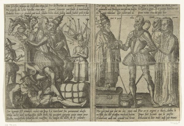 Curator: Ah, yes, "Plate 26: Cerialis Pardons and Relieves Roman Soldiers who had Helped Civilis," an engraving by Antonio Tempesta, dating back to the early 17th century. Look at that precise detail! It’s less an illustration of an event and more a stage for a philosophical musing. Editor: Right. It’s like a freeze-frame from a play. I'm intrigued by the visual hierarchy: the forgiving general looming over the kneeling soldiers. What narrative threads do you pull from it? Curator: See how Tempesta orchestrates the composition. He divides the scene. One side holds stern justice while the other welcomes those who have faltered, seeking forgiveness. Consider this through a broader lens: We witness Cerialis granting clemency not just to soldiers, but perhaps to parts of ourselves. We see both transgression and the possibility of absolution. Don’t you think it’s oddly comforting? Editor: That's insightful. The almost theatrical gesture really underlines that concept of forgiveness being a conscious act. And the architectural background feels like a societal framework for this play of morality. Curator: Precisely. Are those high, impenetrable walls not projections of the constraints that shape us? How often do we feel trapped in such stark compositions, craving that outstretched hand offering respite from judgment? Perhaps the image resonates because we recognize a similar, internalized battlefield, where we battle not Romans, but our demons and misjudgments. Editor: So it's not just a history lesson; it's about our own personal narratives of redemption, framed by self-imposed walls. The print becomes a mirror. That gives me a totally different appreciation. Curator: Exactly! Sometimes, what seems like a distant, historical echo is actually a reflection staring right back. What do you think? Editor: I’ll never look at engravings the same way. I saw a historical snapshot, but now I see something more personal, almost like a map of human fault lines and potential healing. Thanks!