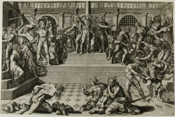 Curator: What strikes me immediately about this print is its energy, how Pieter Nagel uses line to create a sense of dynamic movement. Editor: Indeed. This print, titled "Feeding the Hungry," part of the Harvard Art Museums collection, presents an interesting commentary on social structures through its composition. Curator: Look at the details: The bowls and baskets, the architecture in the background, and the figures themselves, all rendered with varying textures. I wonder about the means through which this image was circulated? Editor: Note also the way Nagel uses the architectural backdrop to frame the act of charity, elevating the scene. There is a certain theatricality to the scene. Curator: Right, because the production of printed images allowed these sorts of moral messages to reach a wide audience, and to influence behaviors, perhaps. Editor: The contrasts in tone and texture create a compelling visual experience. It's a fascinating composition. Curator: Understanding the economics of the printmaking trade offers a new lens. Thanks for your insight! Editor: The formal elements certainly enhance the narrative. A pleasure.
