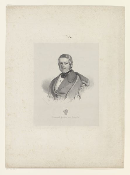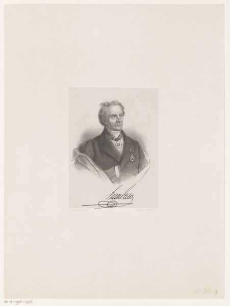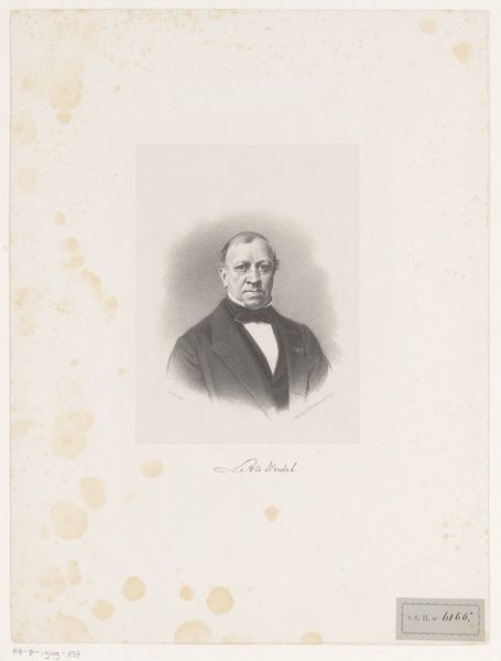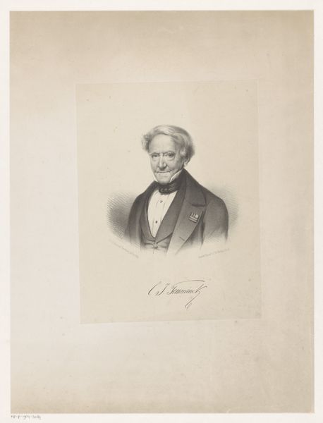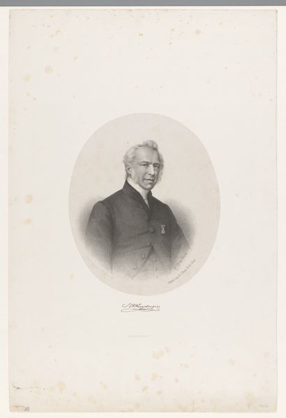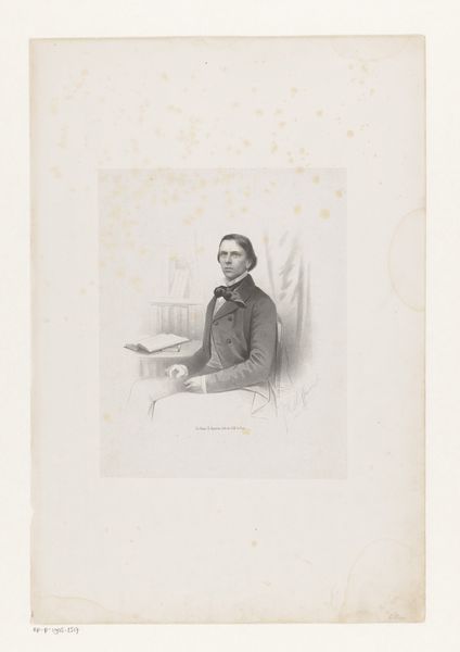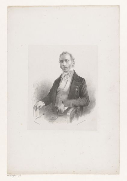 Editor: We are looking at "Portret van een onbekende man, mogelijk Michelet" a graphite drawing made sometime between 1827 and 1862, and attributed to Paul Rohrbach. It’s a rather striking image with beautiful tonality and rendering, but feels a bit formal, rigid even. How would you interpret the visual elements of this portrait? Curator: Focusing on its intrinsic qualities, observe how the artist uses graphite to create a range of tonal values. Notice how these tones model the figure’s face and clothing, and create the overall structure. Consider the use of line – its direction and thickness, to outline shapes. This formal treatment and rendering of shadows describes the textures present. Do you see how the interplay between these formal components structures meaning? Editor: I do see how the artist builds structure with line, shape, and tone. Can you elaborate on what meanings are produced, and where the viewer might locate them? Curator: One may perceive a contrast between the softness of the face, rendered with delicate gradations of tone, and the more rigidly defined lines of the jacket. Note the contrasting directions in the marks used to describe hair. These formal decisions may create dynamism by establishing varying depths across the drawing’s surface. We could even explore how this relates to the Romantic period, which this work represents. Do you observe how these tensions might communicate broader social dynamics of the period? Editor: That’s a great perspective. I hadn't considered the interplay between the formal elements of portraiture and broader questions of period social life and historical context. Curator: Indeed. Close looking reveals intricate compositional structures which relate to more abstract thematic concerns, a dialectic of visual and historical languages, shall we say. Editor: It’s fascinating to consider how artistic choices around something as simple as graphite lines contribute so richly to our understanding and reception.