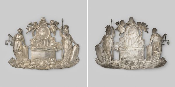 Editor: Here we have Hendrik Danielsz Hooft, burgemeester van Amsterdam, a metal relief sculpture created between 1787 and 1794. The shiny, silvery tones and intricate details depicting figures, a shield, and even a loyal dog give it a heroic and slightly melancholic feel. How do you read the imagery here? Curator: The emotional weight you perceive is palpable. Consider the shield – its dominant placement suggests a concern for protection, perhaps of ideals, tradition, or power itself. Do you notice the figure shielding it? His gesture is revealing of a burdened man holding on, preserving. What emotions surface for you, recognizing the pressure being communicated here? Editor: It's a weighty responsibility, right? There's a sense of clinging, like he's afraid of something being taken away. The classical figure above… is she an allegorical figure watching over him? Curator: Precisely. That classical figure is like a visual memory, representing wisdom, history, a past grandeur. What effect does she create standing behind the Burgemeester, the shield, the defender? Is it like a remembered ideal the Dutch seek to carry forward? How does this inform your sense of continuity? Editor: I see now. It connects Hooft to a larger narrative, grounding his actions in something more profound than just politics. It’s like he’s a link in a long chain. So is the dog on the opposite side a reference to faithfulness? Curator: Indeed, and loyalty—an essential virtue associated with leadership, mirroring his dedication to Amsterdam, even as that role faced challenge. The objects placed deliberately communicate that. Tell me now, what does this all amount to, given our time together? Editor: I was seeing this piece only at surface level, but now understanding the layered symbolism makes it a powerful statement about leadership, tradition, and the weight of history. Curator: Precisely! And in that intersection, the iconographic echoes resonate long after the metal was shaped, don't they?