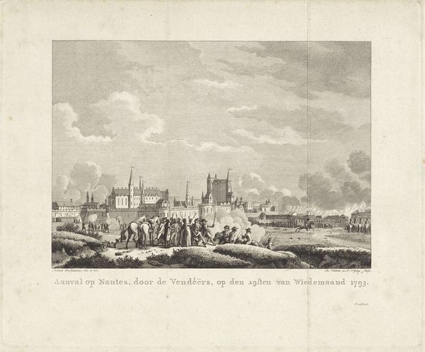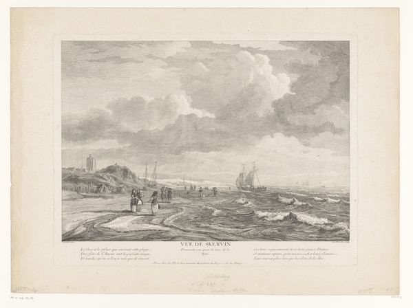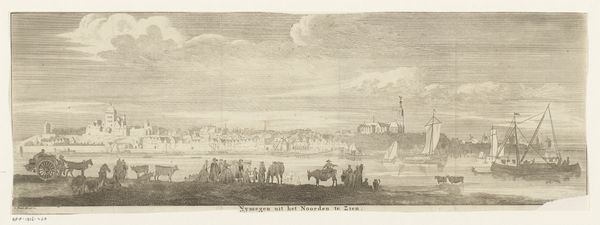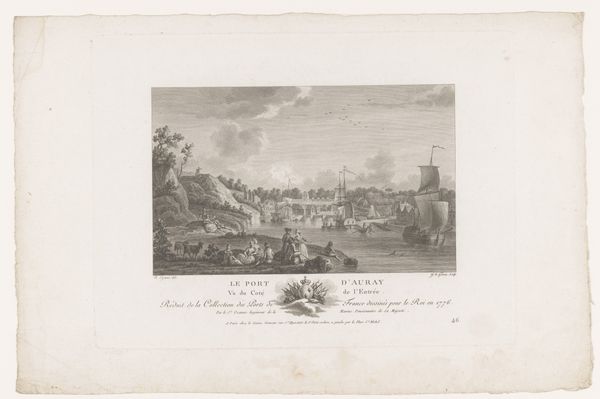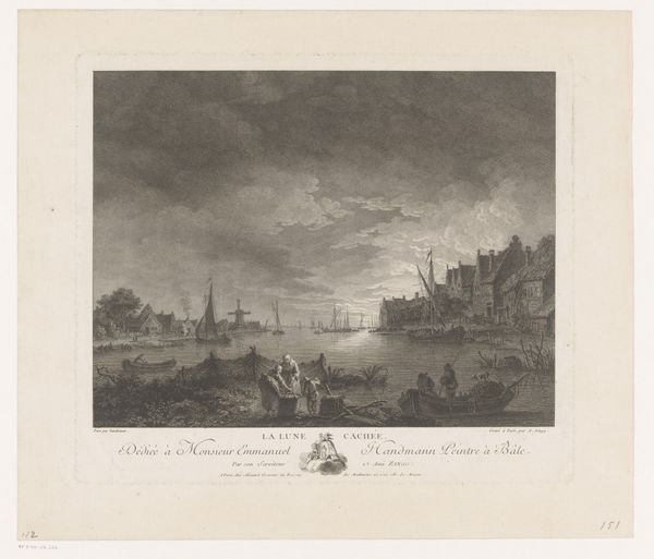 This etching, Sankt Malo havn, offers a detailed rendering of a bustling harbor scene. The artist, though anonymous, skillfully employs line and texture to convey the atmosphere of 18th-century maritime life. The formal arrangement divides the composition into distinct zones: the foreground with its detailed figures, the middle ground occupied by the harbor, and the distant cityscape fading into the horizon. Notice how the linear perspective draws your eye toward the center. The ships and buildings are rendered with meticulous detail. The artist masterfully uses hatching and cross-hatching to build tone, creating depth and volume. These techniques, prevalent in the era, aimed to simulate the effects of light and shadow, thus lending the scene a sense of realism. The print is not just a visual record; it's a structured representation of space and activity. The artist uses the etching to create a sense of order and clarity, which invites us to reflect on the relationship between artistic representation and the world it seeks to capture.