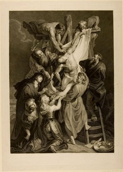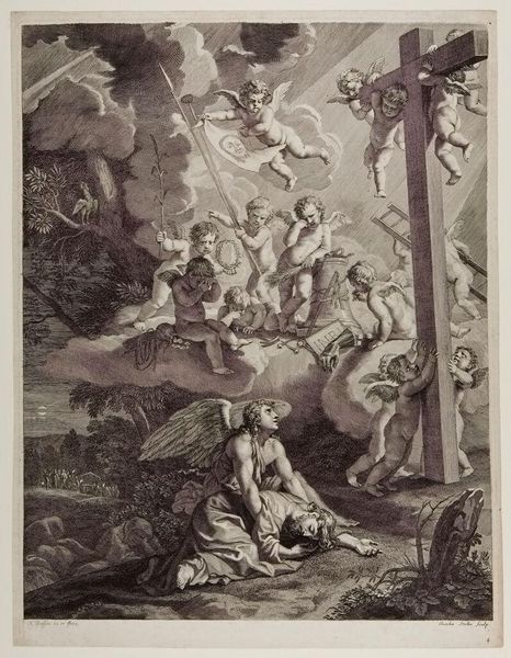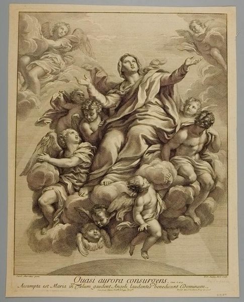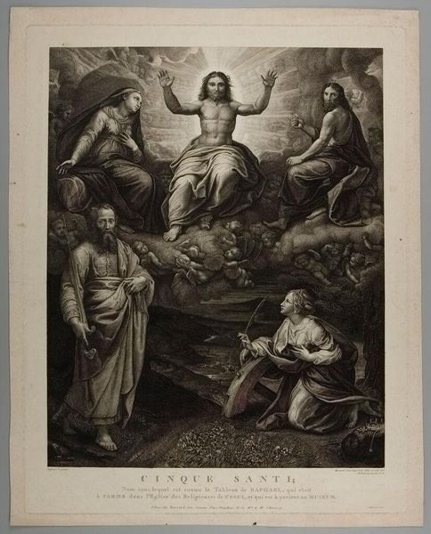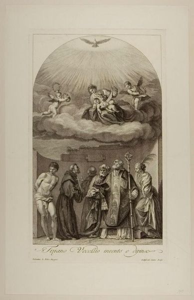Editor: This is Philipp Andreas Kilian’s "Madonna and Child with S. Sebastian," housed here at Harvard. It's an engraving, so the lines are quite precise. I notice Saint Sebastian looking upward, hopeful, toward the Madonna. What historical context shapes this piece? Curator: This engraving served a crucial role in disseminating images of masterworks, effectively democratizing art in the 18th century. Consider how Kilian's print makes Correggio’s painting accessible beyond the elite circles who could visit the Dresden gallery. How does this reproductive process affect the artwork's perceived value? Editor: So, it's less about artistic innovation and more about wider distribution of existing ideas? Curator: Exactly. The print becomes a vehicle for cultural exchange, influencing artistic tastes and religious sentiments across different social strata. We see how imagery reinforces existing power structures. Editor: I see. It's fascinating to consider the social impact of art through these reproductive technologies. Curator: Indeed. Understanding this print is less about the artist's hand and more about the public life it fostered.