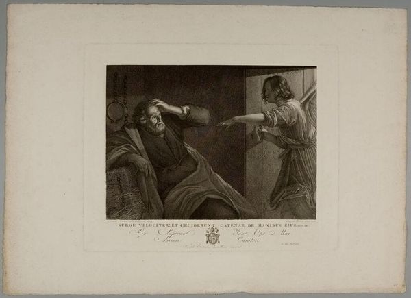 Editor: This is "Hope Sustains the Unfortunate until Death" by Auguste Gaspard Louis Boucher Desnoyers. It feels so somber, the figures are almost frozen in place. What symbols are most prominent to you here? Curator: The angel battling against the tomb speaks volumes. Note how the angel actively pulls the man away from death, while the figure with the lamp passively illuminates, offering perhaps solace rather than intervention. How does this contrast inform our understanding of hope itself? Editor: It's like a struggle between action and acceptance. The angel is fighting, while the lamp figure is resigned. Curator: Precisely. It suggests a complex relationship with hope – sometimes a fierce struggle, sometimes a gentle guiding light. A very powerful contrast. Editor: I see the image carrying many layers of meaning, both fighting and accepting the inevitable. Curator: Indeed. This image embodies a complex interplay of cultural anxieties surrounding mortality, with hope serving as both a shield and a lantern.