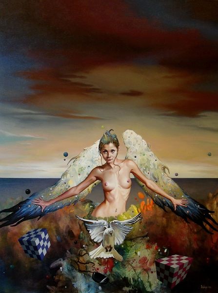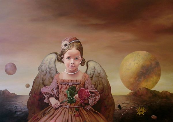 Editor: Here we have "Na pozornici," or "On Stage," painted in 2013 by Dragan Ilić Di Vogo using acrylic on canvas. What immediately strikes me is the almost dreamlike quality – these ballet dancers amidst a surreal planetary landscape. What do you see in this piece? Curator: Well, immediately I see a layered narrative challenging traditional portraiture. The placement of these figures in an extraterrestrial setting pulls us away from familiar contexts and encourages questioning around identity and representation. These dancers, bathed in a gentle, almost ethereal light, are juxtaposed against a stark, otherworldly landscape. Do you think the artist is making a comment about the performance of identity, perhaps particularly feminine identity, on a stage that is not of their own making? Editor: That's a fascinating thought. I hadn’t considered the stage as symbolic of imposed identities. The dancers’ delicate costumes certainly contrast sharply with the rough terrain. Curator: Exactly! The contrast highlights the precariousness of their position, but also maybe their potential for resilience. The celestial bodies looming behind them might be seen as representations of forces beyond their control - societal expectations, perhaps? How might the multiple planets interact to enhance the scene? Editor: They do give it a sense of scale and almost cosmic pressure, furthering the feeling that the dancers are acting out an existential play. Curator: Precisely. And this ‘existential play’, as you put it, reflects larger questions about gender roles, the gaze, and the inherent tensions within performance itself. We are confronted by the gaze, literally by one of the figures staring at the audience, as well as by planets which appear to be gigantic eyeballs staring back at us! It highlights the social forces at work and the power of the performer on one hand to command attention but also the precariousness of the performer given how much attention is on display. What do you think? Editor: This has given me so much to consider about performance, pressure, and the construction of identity within art, thank you. Curator: The intersection of art and social commentary opens up endless possibilities for reinterpreting not only artworks but also how we view the world.