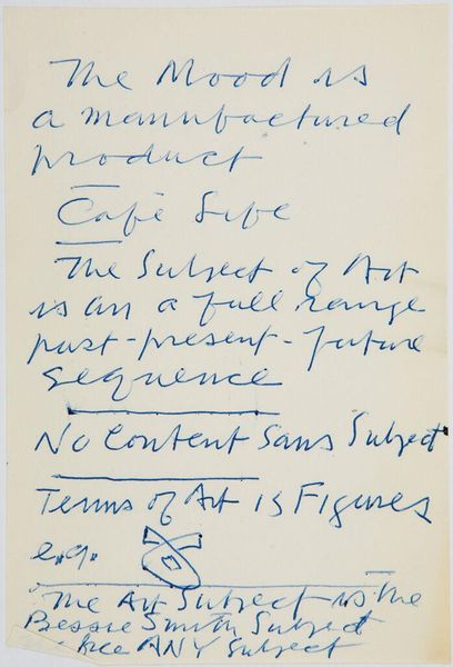 Editor: This is Stuart Davis's "Art Theory Text with Too Moons." It's undated, but it really strikes me as more of a textual sketch than a finished piece. What do you see in this work? Curator: I see Davis grappling with the very definition of representation, questioning how we perceive form and color. This piece embodies the radical shift of the time, a break from traditional artistic norms. How might his ideas reflect the cultural anxieties of the early 20th century? Editor: So, this is Davis exploring the boundaries of art itself? Curator: Precisely! By deconstructing the figure, he invites us to question the structures of seeing and understanding in a rapidly changing world. It's all about context and the artist's struggle. Editor: That's really interesting. I hadn't thought about it in those terms. Curator: Consider the political landscape, the rise of industrialization. Davis used art as a tool to challenge the status quo. Editor: I'll definitely look at this differently now. Thanks! Curator: Absolutely. Remember, art is rarely just about what you see, but about the conversations it ignites.