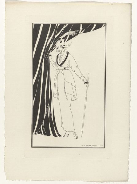 John Austen's 'Hamlet' renders Shakespeare's iconic character through the stark contrast of black ink on white paper, enclosed within a decorative circular frame. The eye is immediately drawn to the dramatic costume of Hamlet, patterned with bold, crescent shapes, that dominates the composition. This stylized approach, typical of Austen’s era, flattens the figure, emphasizing surface pattern over depth. The swirling smoke from the candle and the ornamental details within the circle introduce a sense of unease, playing with semiotic codes of melancholy and the supernatural often associated with Hamlet. Austen uses line not merely to define form but as a graphic element, contributing to the overall design rather than realistic representation. The tension between the representational and the decorative destabilizes traditional notions of portraiture. In doing so, Austen invites us to consider the character of Hamlet not just as a literary figure but as a construction of visual and cultural signs. This allows Austen to engage with broader aesthetic and philosophical debates about the nature of identity and representation.