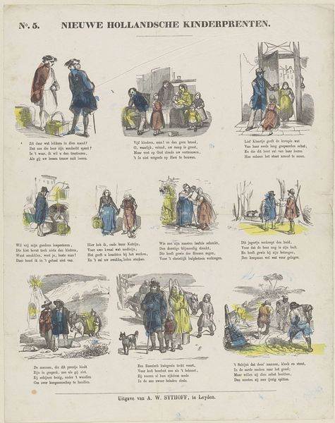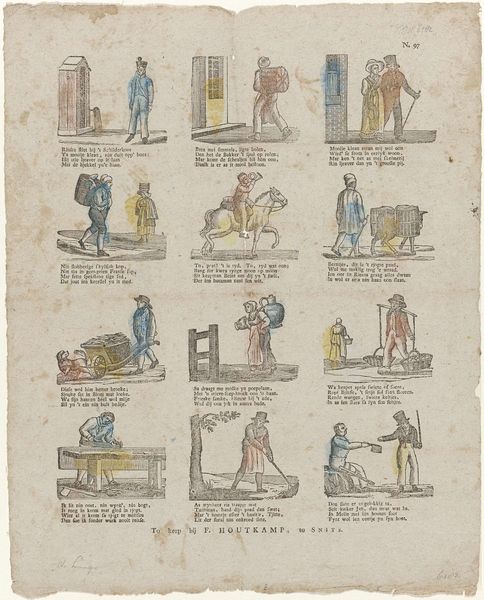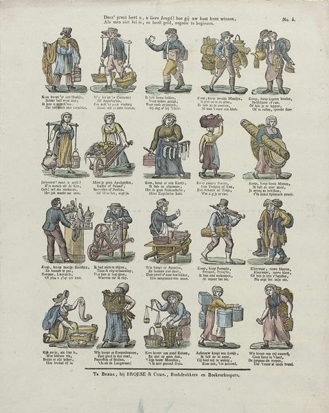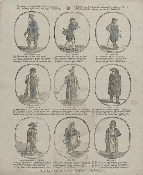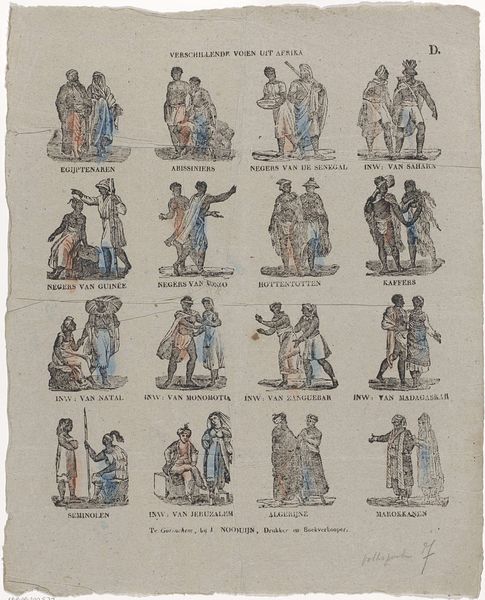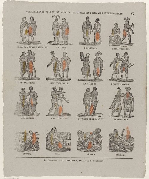 Curator: Immediately, a muted, almost melancholy air. It’s the limited color palette, perhaps, that lends this antique feel—though the subjects are teeming with implied narratives. Editor: Indeed. This is a print titled "Verschillende volken uit Azie en Australie," or "Different Peoples from Asia and Australia," dating roughly from 1819 to 1840. It's housed here at the Rijksmuseum and attributed to Alexander Cranendoncq. It depicts various ethnic groups, rendered through engraving on paper. Curator: "Different Peoples" sounds clinical, doesn't it? And "rendering" feels so cold. I sense Cranendoncq aimed to capture essences—those imagined truths of far-flung lives. But does "essence" collapse into stereotype in a project like this? Editor: That’s a key question when considering images from this period. Prints like this were often made for educational purposes, or perhaps to satisfy a public curiosity about other parts of the world, particularly through the lens of nascent Romanticism and what we now recognize as Orientalism. Curator: Ah, the double-edged sword of Romanticism! It promises empathy, even wonder, but all too often delivers caricature draped in exoticism. Look at the postures: each pair stiffly represents, embodies...what exactly? What stories are unspoken, lost in translation? Editor: The charm, I suppose, lies in that tension. These aren’t photographs attempting realism. Instead, each vignette acts as a cultural shorthand. It's up to us to unpack those assumptions. We must remember that depictions of the 'exotic' in art are intrinsically tied to the socio-political contexts in which they were made. How empires understood, and often misunderstood, their territories and the peoples who inhabited them. Curator: It feels ethically fraught now, doesn't it? Though visually captivating, one wrestles with the implications of viewing other cultures almost like specimens pinned to a board. Editor: Absolutely. Recognizing that discomfort, engaging critically with these prints, allows us to confront our own historical position. It serves as a valuable reflection on representation and power dynamics. Curator: Beautifully put. This compels us to be viewers more conscious—perhaps to unlearn as much as we learn, in looking. Editor: Precisely. A challenge, and perhaps even an invitation to deconstruct inherited ideas.