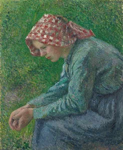 Camille Pissarro, painted 'Seated Peasant Girl' using oil on canvas. In his work, Pissarro often turned to rural subjects, capturing the lives of the working class in the French countryside. During this time, France was undergoing significant social changes. As industrialization grew, rural populations were moving to urban centers, altering the social fabric of the nation. The seated peasant girl, headscarf pulled forward, sits with her basket. She looks down, seemingly lost in thought. We can imagine the painting as a social commentary, subtly highlighting the often-overlooked contributions and experiences of rural women. Consider how the artist’s choice to depict this woman invites empathy and reflection on the lives of those who sustain the land. Through the act of observing and representing this peasant girl, Pissarro elevates her status, acknowledging her importance within the rural landscape. He urges us to consider the untold stories and quiet dignity of those whose labor shapes the world.