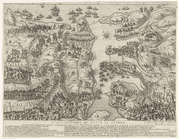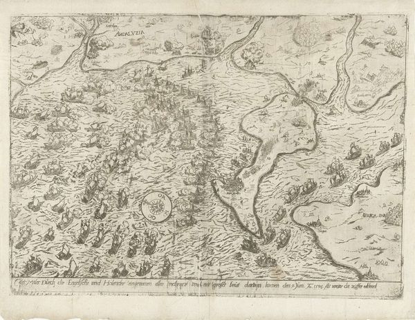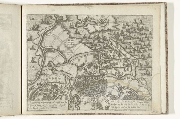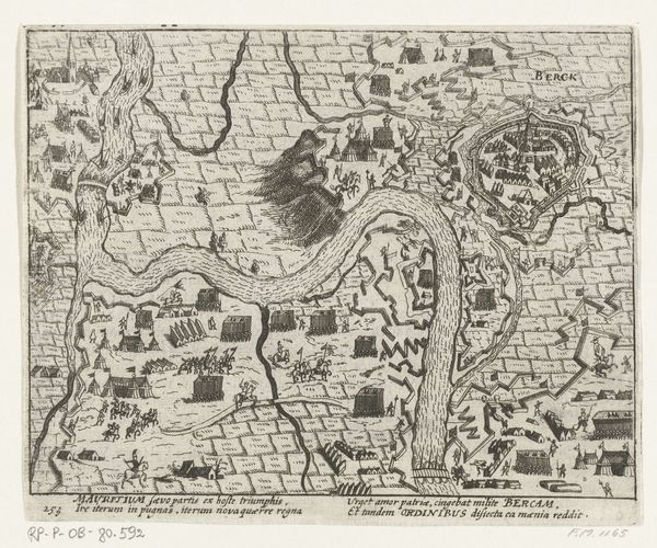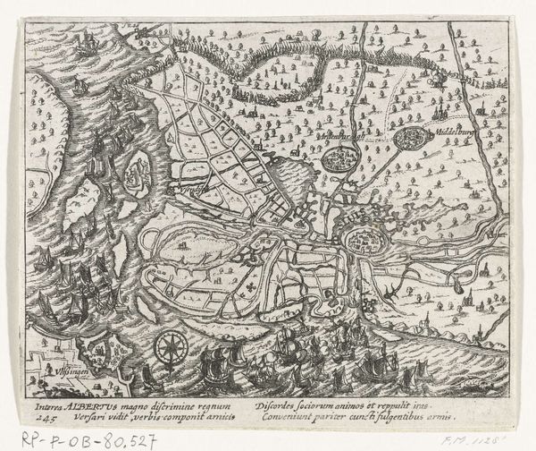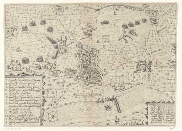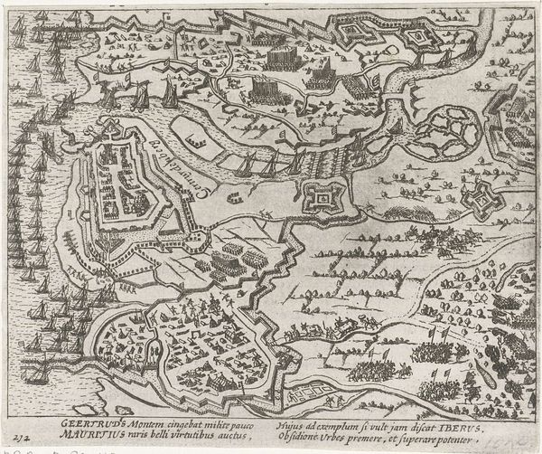 This anonymous engraving depicts the siege and capture of Grave by Maurice of Nassau in 1602. At first glance, we see a bird's-eye view of the battle, dominated by the rivers and fortified city. The overall composition, with its detailed rendering of military formations, echoes ancient Roman battle maps, where the landscape became a stage for power and conquest. Consider, for instance, the wheel, a symbol repeated in cartography throughout history, and even reappearing in the printing press which made this image possible. It reminds us of the Fortuna wheel, an allegory of instability and unpredictability. Such symbols recur across time, manifesting in Renaissance emblems and even modern advertising. The act of mapping itself is a symbolic gesture, a way of imposing order on chaos, and asserting control over territory. These maps become powerful psychological tools, shaping perceptions and influencing the collective memory of historical events. This image resonates as a testament to human ambition and the enduring quest for dominance, forever etched in our cultural consciousness.