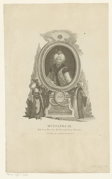 Curator: What a compelling glimpse into Prussian aristocracy. This is Johann Esaias Nilson’s “Portret van August Willem van Pruisen,” an engraving dating sometime between 1731 and 1788, now residing here at the Rijksmuseum. Editor: It strikes me as remarkably staged, almost theatrical. The way the figures are arranged feels less about individual representation and more about projecting an image of dynastic power. The elaborate ornamentation makes me feel like I am watching a play. Curator: Exactly! The ornate cartouche surrounding the portrait itself acts as a frame within a frame, further emphasizing the constructed nature of the image. Flags, floral arrangements—symbols meant to legitimize and amplify authority. Look closer, there’s a solar symbol around his arm, highlighting a kind of divinely ordained status. Editor: That symbolism is interesting considering August Wilhelm’s complex legacy. He wasn’t exactly a celebrated figure, his military capabilities were often questioned, particularly in comparison to his brother, Frederick the Great. This image seems to perform a specific kind of myth-making, glossing over the complexities of his persona. Is he hiding behind a fabrication? Curator: That is something to consider, certainly. However, don't miss the way Nilson is actively recalling artistic precedent. I notice elements in the framing, as well as some of the staging, as almost borrowed, like a pastiche from works of older masters from prior eras. Editor: I agree; however, his is image management, visual propaganda meant to buttress a certain ideal of Prussian power through cultural production and visual iconography. I can’t help but see these images as participating in systems of power that actively marginalized others. Who benefits from this idealization, and at whose expense? Curator: Yes, the layers of meaning embedded in this seemingly simple portrait offer much to contemplate. It reminds us that images are rarely neutral, and it can be fascinating to pick apart some of the complex cultural influences that are often at play in portraiture from this period. Editor: Indeed. It’s a potent reminder that even images rooted in the past have the power to spark essential dialogues about representation, power, and their enduring consequences.