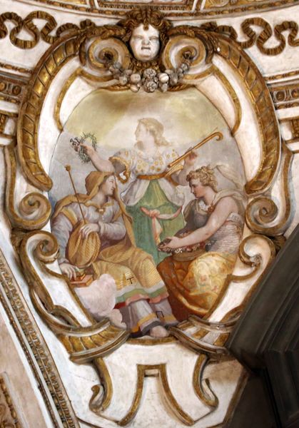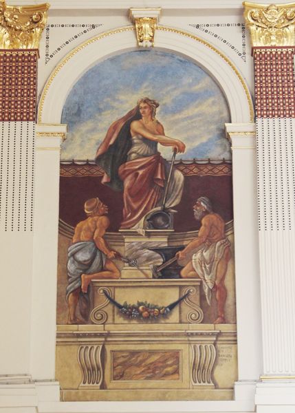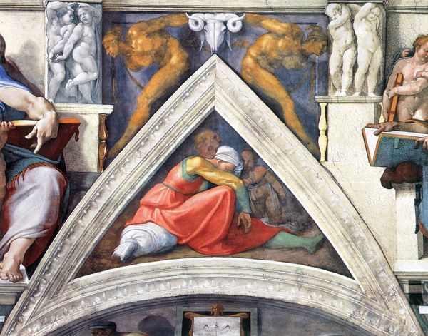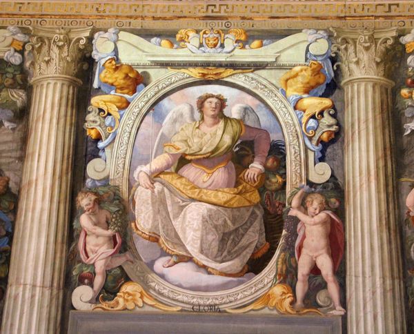 Editor: So this is Alessandro Allori's "Fame," a fresco from 1582. The way the central figure is brightly lit, with strong, active movement feels really assertive. What do you see in this piece, especially regarding its historical context? Curator: It’s easy to see “Fame” as a celebration of achievement, which aligns with Renaissance values. But I’d like us to think about the concept of fame itself, particularly during that period. Who gets to be famous, and why? Who is history kind to, and who does it erase? This isn't a neutral image. Allori and his patrons were working within a power structure, defining what "fame" even meant, shaping public memory for future generations. The composition— the way this figure literally towers above and almost tramples someone at the bottom— it all speaks volumes about power. Editor: That makes me reconsider the central figure’s assertiveness… Almost aggressive, you mean? Like fame is something *achieved* by stepping on others, not necessarily something deserved. Curator: Precisely. This era, rife with its own internal and external power struggles, political maneuvers, religious reformations and so forth, demanded loyalty. The Mannerist style itself –the elongation of figures, the almost artificial dynamism – adds another layer. It wasn't about simple, clear representation, it's a statement. It forces us to ask whose stories are being told and whose are being silenced in this pursuit of "Fame". Think of all the countless stories that went unrecorded, the perspectives that weren’t valued. Editor: That completely shifts my understanding. I initially saw a straightforward celebration, but now I see a complex, even troubling commentary on power and visibility. Thanks. Curator: Indeed, that's how the past speaks to the present, inviting constant reevaluation, revealing the inherent biases in even the most celebrated stories. Art like this forces us to wrestle with the ethics of representation.