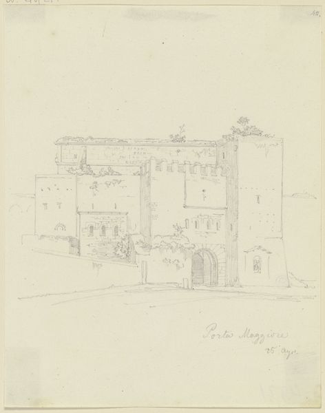 Editor: This is "Gateway to Carisbrook Castle I. of Wight" by J. of Canterbury Martin. It looks like a watercolor. The scene has a very subdued quality. What strikes you about its composition? Curator: Note how the architecture is rendered. The lines are not perfectly straight, the tones are subtle. The artist has prioritized the visual impact over precise representation. The lack of vibrant color reinforces the somber mood. What effect do you think this artistic choice achieves? Editor: Perhaps to highlight the castle's age and stoic permanence through its somewhat faded representation? It lends a sense of history. Curator: Precisely. And consider how the artist uses layering to create depth, particularly within the foliage. This creates a captivating tension between surface and space, wouldn't you agree? Editor: Yes, I see that now! Thanks for helping me appreciate these formal qualities. Curator: A pleasure. Paying attention to these elements heightens our understanding of the work's overall impact.