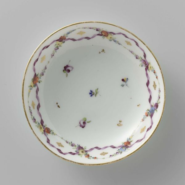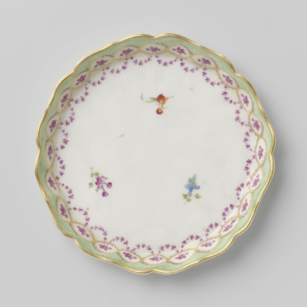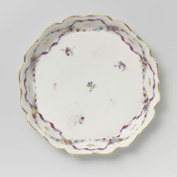 Curator: Looking at this porcelain plate, created around 1782-1784 in Loosdrecht, I immediately notice the lightness and delicate air it exudes. Editor: It certainly seems characteristic of its time, doesn't it? We see this delicate quality quite frequently in Rococo decorative arts. Curator: Indeed. Let’s delve deeper into the means of its production. This “Schotel,” as it’s known, showcases both hand-painting and the meticulous labor involved in crafting fine porcelain during that era. The soft paste porcelain, known for its lower firing temperature, required specialized skills, as Loosdrecht was really testing out its manufactory. Editor: The Loosdrecht factory’s place in the story of Dutch porcelain is significant. They benefited greatly from the expertise of knowledgeable entrepreneurs. These were people looking to establish industries for their own gain within the social structures and markets of the time, to build luxury networks catering to a specific clientele. Curator: Exactly! You can see the emphasis on ornamentation typical of the time. Consider the labor involved in rendering those tiny floral motifs scattered across the plate! The floral sprigs contrast nicely with the ornate volute band, don't you think? I see not only the aesthetic choices but also the underlying commercial strategies at play. Editor: Definitely. These decorative elements would’ve been fashionable and therefore profitable. Wealthy patrons certainly admired items like these. It's a fascinating example of the intersection of artistic production and consumption in the late 18th century. Curator: It truly reflects a convergence of material, skill, and market demand. I think what intrigues me most is considering all of these different levels as design aspects in and of themselves. Editor: I agree; appreciating this plate encourages us to think critically about the intertwined histories of art, society, and industry. The plate represents how imagery played into the socio-political fabric of its moment, and really provides us a unique understanding of Loosdrecht at the time.