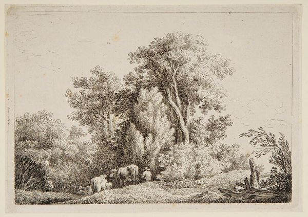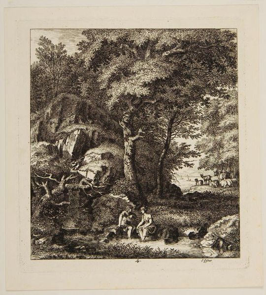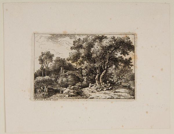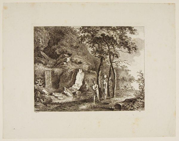 Editor: This is Ferdinand Kobell’s "Two Travellers in the Woods." It looks like an etching, judging by the fine lines. It feels like a quiet moment, but I wonder what the story is behind these figures. What do you see in this piece? Curator: Well, this print reflects the 18th-century interest in the picturesque, but also the social structures of the time. Note how the figures are positioned. One is clearly in a position of service, standing while the other relaxes. Editor: So, it's not just a peaceful scene, but a reflection of class distinctions? Curator: Precisely. Consider how landscape art often served to naturalize existing power dynamics. It's a subtle form of social commentary. Editor: That’s fascinating. I never would have considered that the setting itself could be a commentary on societal roles. Curator: Exactly! Now, how does understanding that change your perception of the "quiet moment?" Editor: It makes me realize how much context shapes what we see. Thanks for opening my eyes.